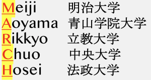 如今正值陽春三月,而三月的英文單詞正是MARCH,小編今天就來給大家介紹一下在日本關(guān)東區(qū)內(nèi)僅次于最難關(guān)私立大學(xué)群【早慶上理ICU】的關(guān)東中堅(jiān)私立大學(xué)群-MARCH:明治大學(xué)、青山學(xué)院大學(xué)、立教大學(xué)、中央大學(xué)、法政大學(xué)五所大學(xué)。MARCH這個(gè)名字,最早是由日本雜志《螢雪時(shí)代》的主編代田恭之提出的。由于日本大學(xué)的合格發(fā)布時(shí)間大多數(shù)都在每年的三月,而MARCH又是這五所人氣名校的日文羅馬音首字母的合寫,因此索性就使用三月的英文單詞來作為它們的昵稱。(圖:MARCH為對(duì)應(yīng)名校名稱縮寫)由這五所大學(xué)組成的關(guān)東中堅(jiān)私